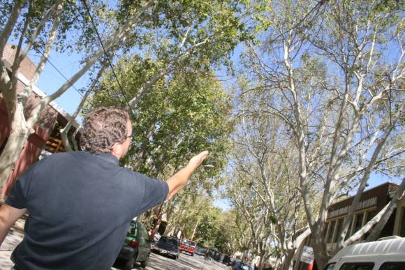 A los 12 árboles que están en la vereda Norte de calle San Luis, entre Güemes y Caseros, se les puede contar cada una de las ramas, porque casi no les quedan hojas. La mitad de la cuneta de riego está seca, llena de hojas y tapada con bolsas. Y detrás, en la orilla de la vereda, se puede ver los caños negros de la obra cloacal que están haciendo en la cuadra siguiente y que ya realizaron en ese sector. Según los vecinos, que riegan con baldes los árboles para tratar de salvarlos, los plátanos se secaron porque por la obra taparon las acequias con escombros y cortaron el agua.