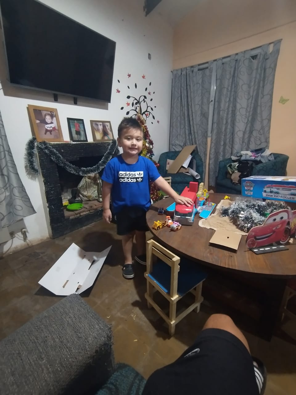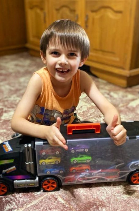 Facundo , de 5 años y vecino de Rivadavia, recibió un camión lleno de autitos.