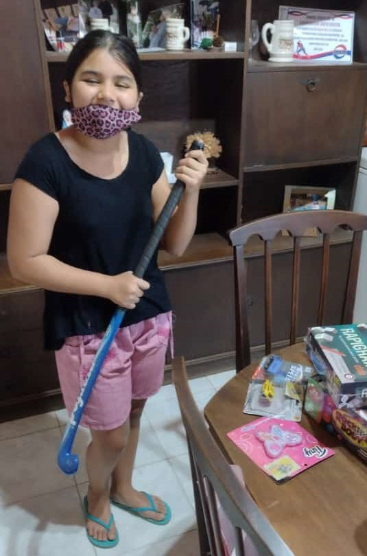 Zahira, una caucetera de 12 años, lució su stick de hockey y sus juegos de mesa.