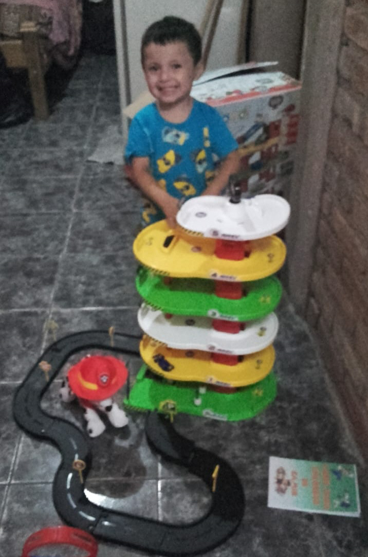 Samir recibió en su casa de Chimbas un garaje de juguete con una pista de autos.
