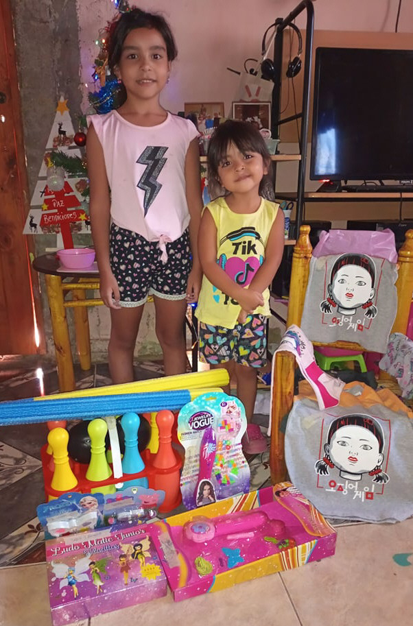 Macarena (7) y Sofía (3) recibieron múltiples obsequios, entre ellos un bowling y lanzaaguas.