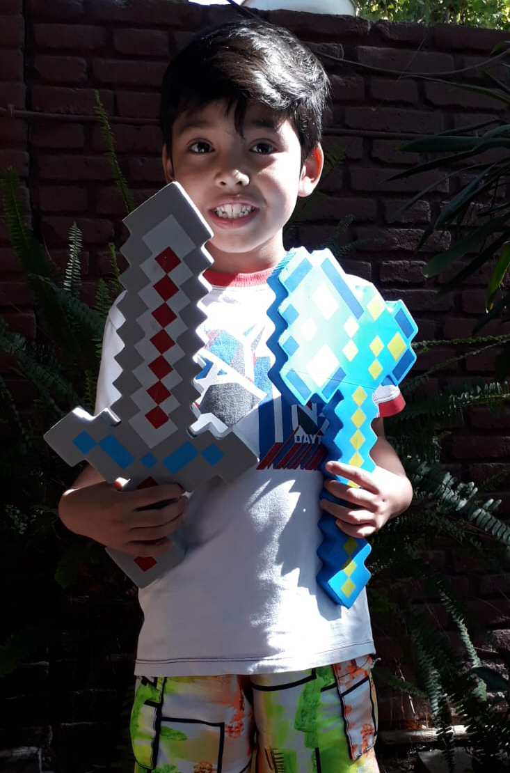 Juan Pablo Sosa (7), un nene de Capital, salió corriendo a estrenar sus armas de Minecraft.
