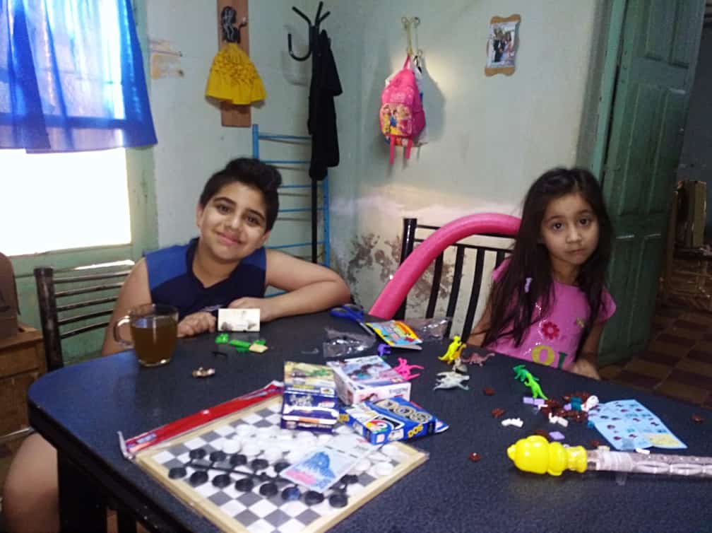 Axel e Isabella Olmos, 11 y 5 años, Legos, juegos de mesa y para la pileta.