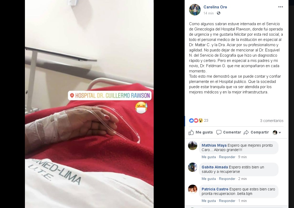 “Como algunos sabrán estuve internada en el Servicio de Ginecologia del Hospital Rawson, donde fui operada de urgencia y me gustaria felicitar por esta red social; a todo el personal médico de la institución en especial al Dr. Mattar C. y la Dra. Aciar por su profesionalismo y agilidad. No puedo dejar de mencionar al Dr. Esquivel N. del Servicio de Ecografia que hizo un diagnóstico rápido y certero. Pero en especial a mis padres y mi novio, Dr. Feldman G. que me acompañaron en cada momento”, escribió.