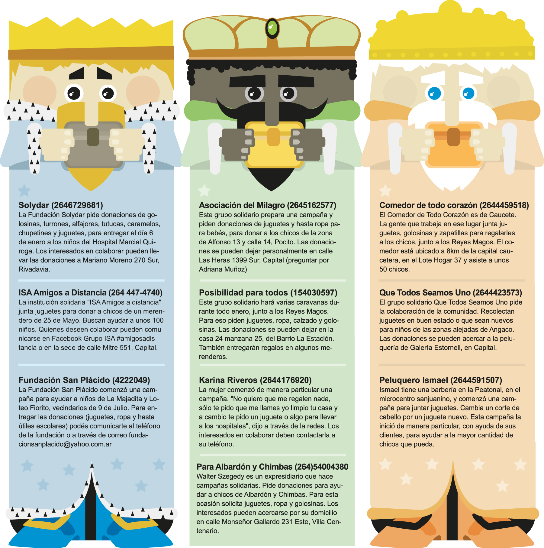 Fundaciones, ONG, grupos de amigos y hasta personas de manera particular comenzaron con las campañas, que servirán para que los chicos de diferentes departamentos reciban regalos. Hay algunos que, además de pedir donaciones de juguetes y ropa, piden golosinas y otros alimentos, para colaborar con el resto de la comunidad que será beneficiada. A continuación una guía con los lugares para ayudar a los Reyes, que contiene los contactos para poder hacer la entrega de las donaciones.