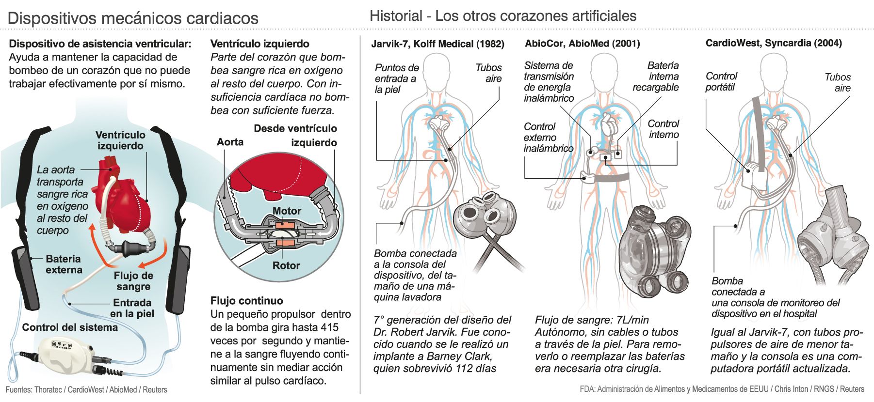 Uno de estos dispositivos se trata de un tipo marcapaso que restituye los latidos de manera natural, pero el más destacado es el corazón artificial total que no reemplaza al humano, pero que cumple todas sus funciones (ver aparte). "Este corazón es como una especie de bomba centrífuga que extrae la sangre y la envía a la aorta. Este dispositivo se coloca internamente, conectado al corazón, y es alimentado por una batería externa", explicó Nievas.