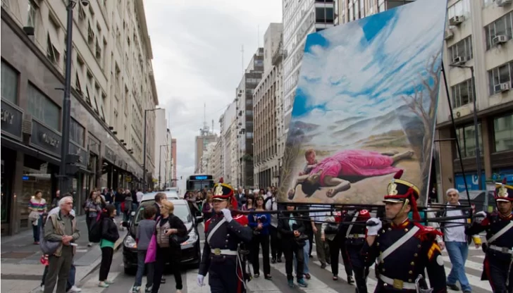 Buenos Aires.- Una manifestación que partió desde la Casa de San Juan con un cuadro de la Difunta Correa, en avance por Avenida Corrientes hacia el Centro Cultural "Paco Urondo", quebró hoy la rutina urbana con la imagen de la mujer mítica reinterpretada por Tiziano Fabris a partir de la escena de un niño al lado de su madre muerta con la que Juan Blanes retrató la epidemia de fiebre amarilla.