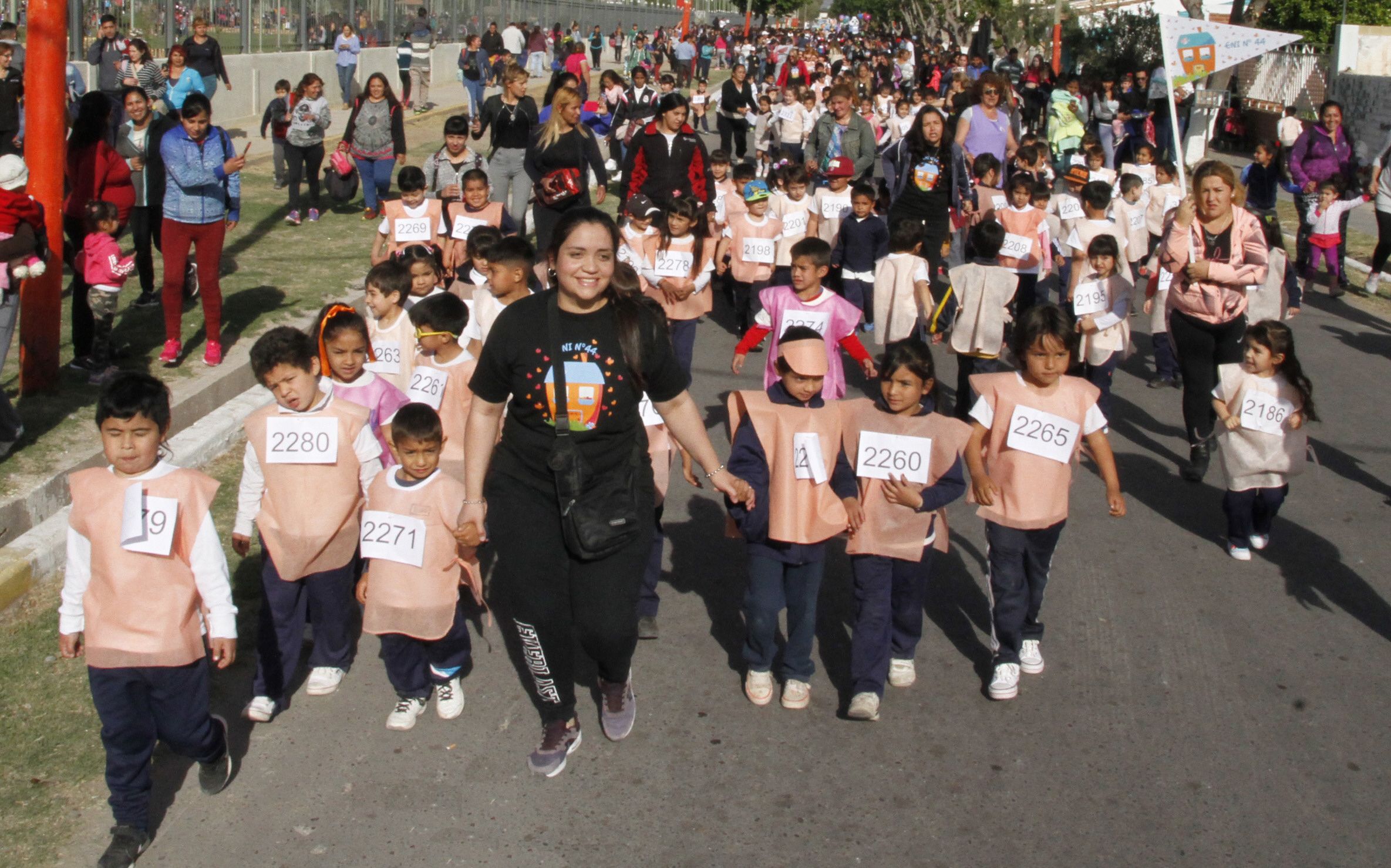 Por grupos, por colores, por jardines y rodeados de una soga para evitar que se dispersaran, avanzaron lo más rápido que pudieron por la calle. Algunos lo hicieron solos, otros de la mano de su mamá. Así recorrieron cuatro cuadras alrededor del Parque de Chimbas. Fue en el marco del primer maratón de los jardines de infantes que se organizó en ese departamento y que el Ministerio de Educación tomó como actividad de cierre de la Semana de los Jardines de Infantes que comenzó el lunes pasado. Fueron más de 2.000 niños entre los 3 y 5 años que apostaron por esta actividad organizada por la Municipalidad de Chimbas. Participaron 25 ENI, varios jardines maternales del departamento y 4 Centros de Desarrollo Infantil. Cada salita estuvo identificada con un color y no importó quién llegaba primero. El objetivo fue correr en grupo y llegar a destino de la mano de las seños.