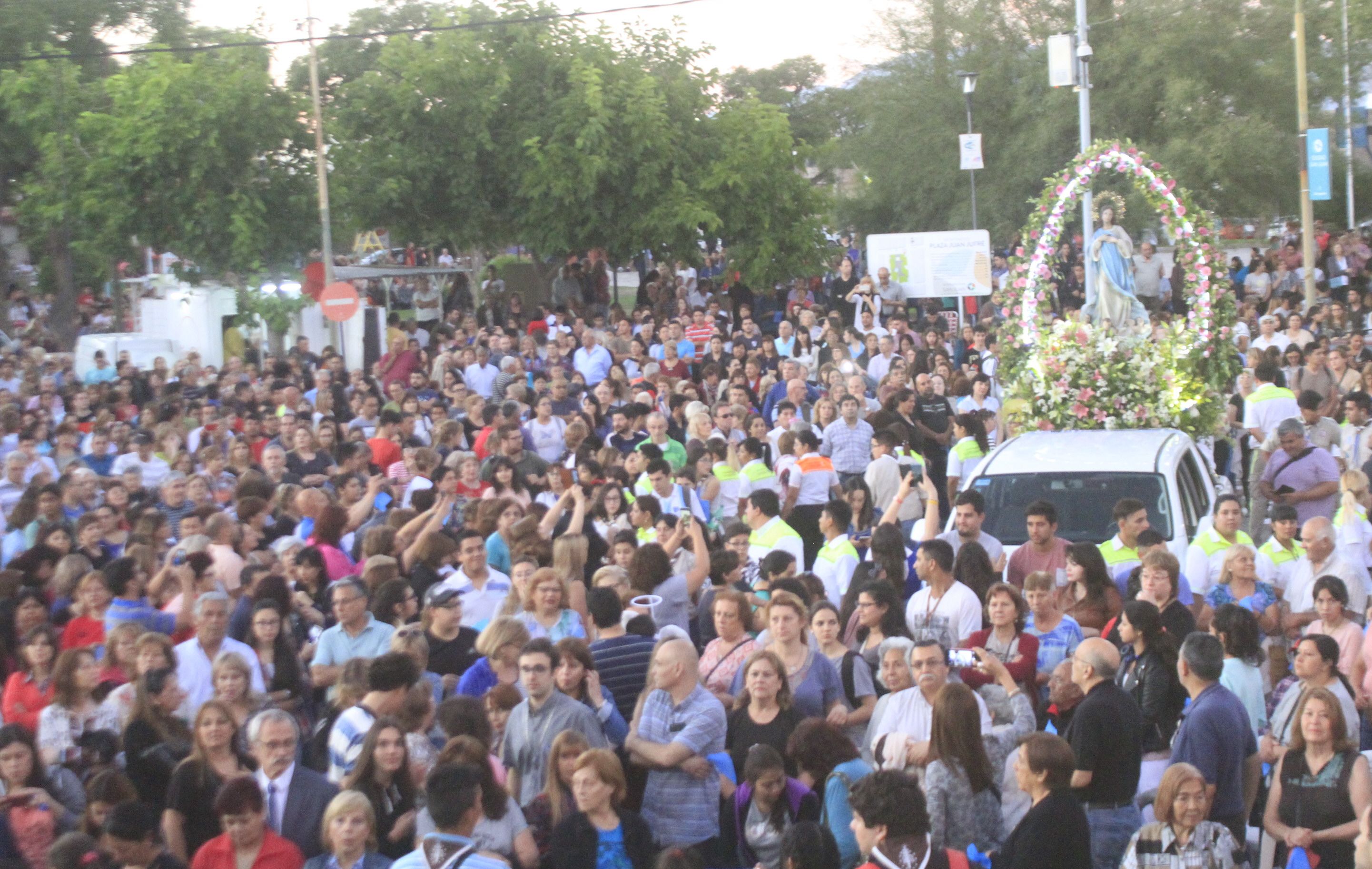 Además de los que caminaron varias cuadras para demostrar la fe por la Virgen, estuvieron aquellos que desde bien temprano hicieron un acampe en la plaza Juan Jufré. No importó la edad ni la condición física. Todos estuvieron expectantes a la llegada de los peregrinos y recibieron la procesión con bombas de estruendo y con pañuelos celestes y blancos, los colores de la Virgen María.