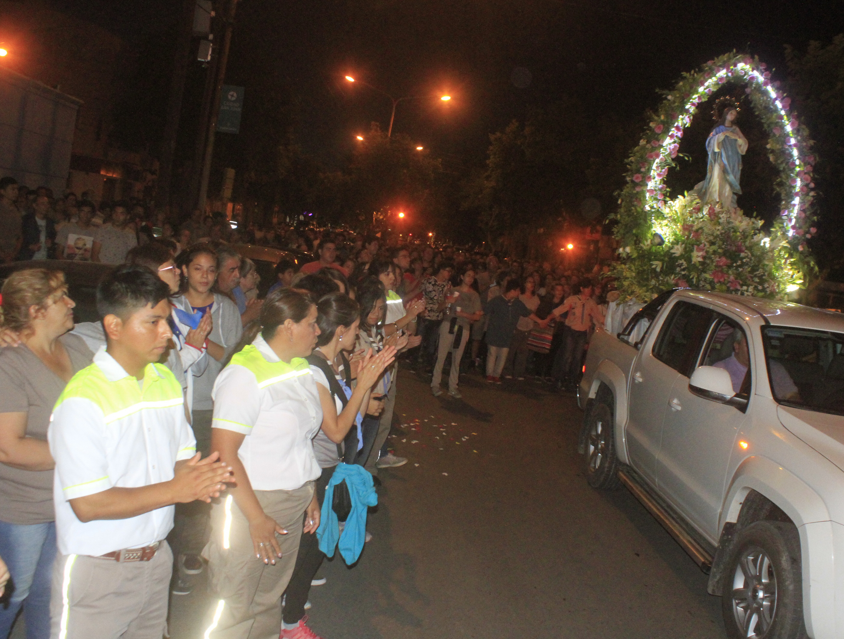 Los caminantes avanzaron rezando el rosario. Mientras, monitores urbanos y chicos de la Acción Católica y de la comunidad de la Parroquia armaron un cerco humano alrededor de la imponente imagen que en plena noche no dejó de llamar la atención de los conductores que a esa hora circulaban por la zona.