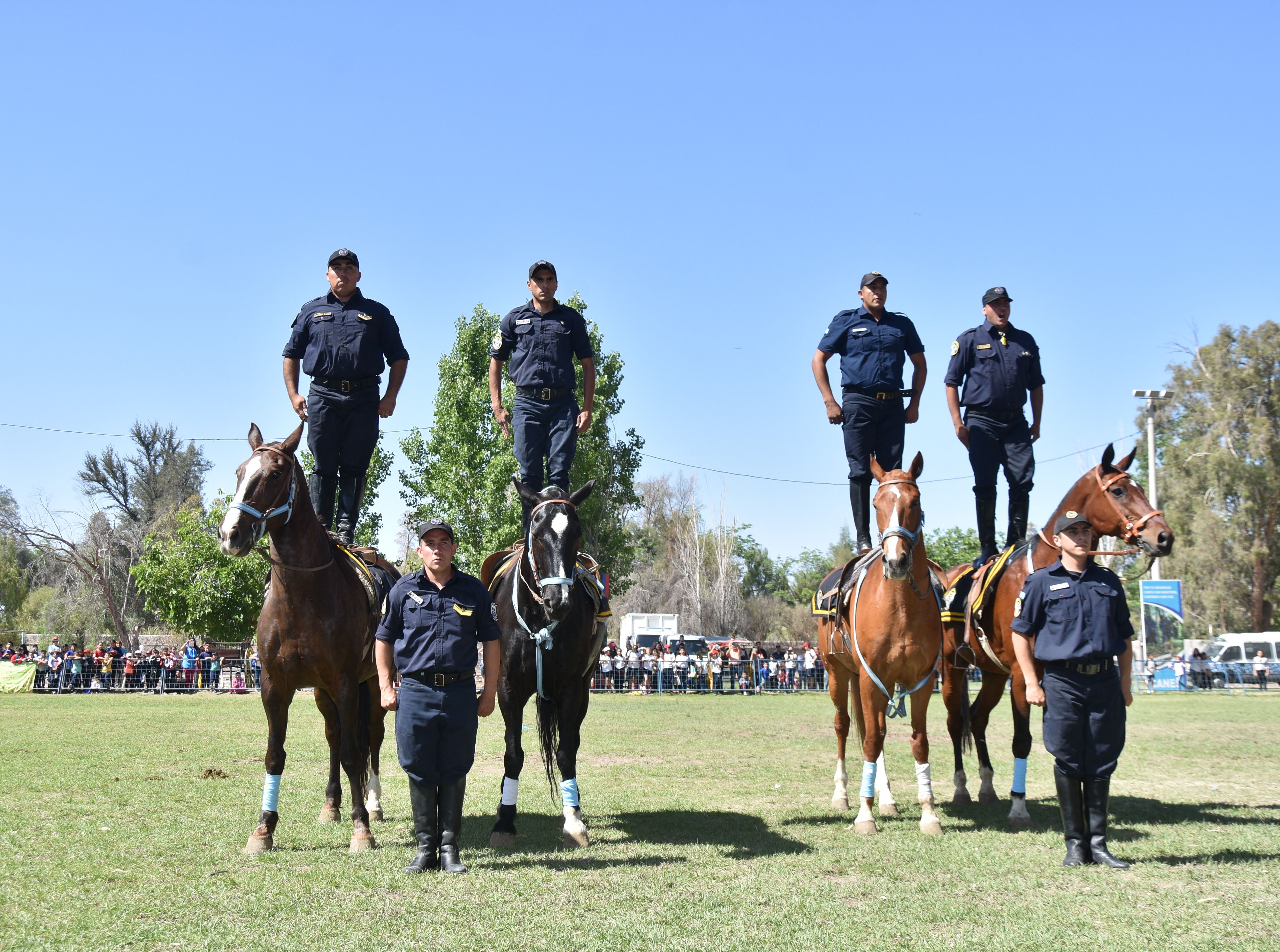 Luego llegó el turno del respeto. Los chicos se pusieron de pie cuando ingresó una tropilla embanderada. El jefe de la Montada encabezó la columna portando la Bandera de Cabot, seguido por 8 jinetes más que llevaban banderas argentinas. Tras recibir el aplauso de los niños y las coplas del payador José Riveros, comenzaron con la exhibición que también revolucionó a la gente. Los jinetes cabalgaron de pie sobre el lomo de los animales, acto que desató la euforia total.
