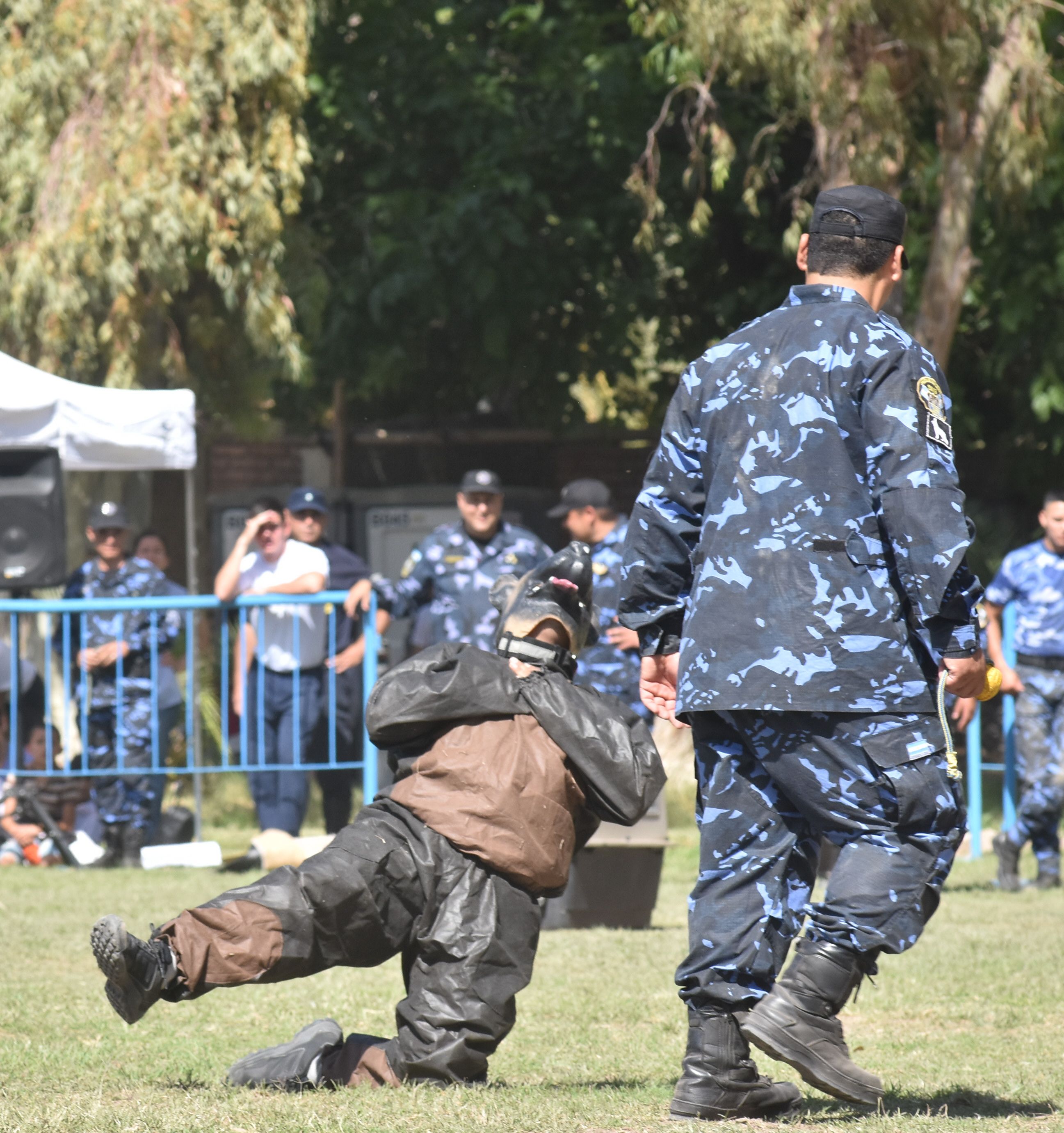 Cuando todo parecía indicar que ya nada iba a superar el asombro en los chicos, apareció en la cancha y de sorpresa un personaje fuera de serie. Fue Can Galán, el perro que personificó disfrazado uno de los efectivos de la División Canes. Por sus ocurrencias, encendió la alegría y el entusiasmo de los niños. Como los canes verdaderos, comenzó a caminar en cuatro patas y al lado de su entrenador para demostrar su sentido de obediencia. Luego, recibió la orden de saludar al público y la cumplió, pero de una manera muy particular. Se puso de rodillas, dobló los brazos y agitó la mano diciendo hola. Niños y grandes estallaron en carcajadas por la ocurrencia, igual que cuando este can humano se hizo el muerto. Es que antes de caer duro al suelo se golpeó el pecho con una mano y emitió un quejido.