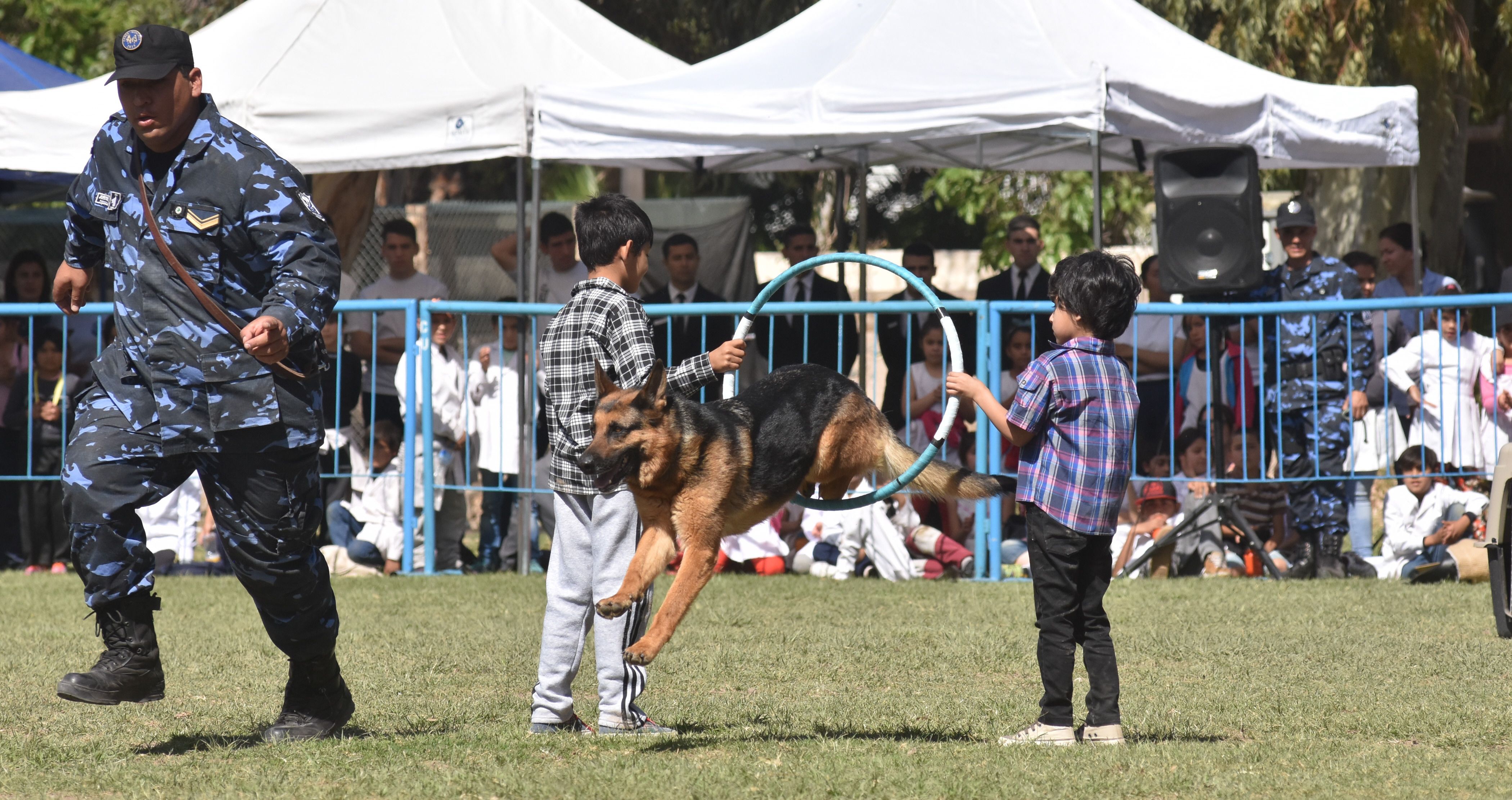 La aparición de Cora y Laica arrancó los primeros suspiros del público. Estas dos perras ovejero alemán ingresaron corriendo al predio para dar inicio a la muestra que revolucionó a los niños y fomentó el amor por los animales. Fue la Segunda Exhibición Anual de la División Canes y Montada que se realizó ayer en la Escuela de Policía y que incluyó algunas sorpresas como la personificación de un perro que causó furor entre los presentes. Unos 500 alumnos de diferentes escuelas participaron de esta actividad.