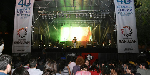 San Juan.- El festival por la Memoria, la Verdad y la Justicia tuvo una masiva concurrencia en la intersección de calle Las Heras y Libertador donde se montó el escenario. Los sanjuaninos llegaron desde temprano para escuchar a los artistas locales y poder conocer cada uno de los stands que se dispusieron desde el Gobierno para el público.