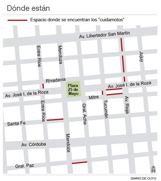 Entre las cuatro avenidas (Córdoba, Libertador, Rioja y Alem), hay al menos 9 sitios donde estas personas rotan de horario y lugar para no ser detectados por la Policía. Cuidan las motos que están en los boxes que demarcó la comuna. Pero cuidar vehículos a cambio de dinero en la vía pública está prohibido por ordenanza municipal. Estos cuidamotos no dan sus nombres y es difícil hablar con ellos, porque, según los tradicionales cuidacoches, son nuevos en el oficio y “no entienden los códigos”. “Son muchachos más bien jóvenes que se metieron al centro y quieren sacar una fortuna en un día cuidando motos. Pero no saben que eso también lleva una responsabilidad”, dijo José Luis Cerdera que es “trapito” desde hace más de 20 años y que desde que funciona el ECO se moviliza por las zonas aledañas.
