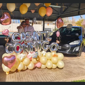 "Jamás en mi vida hubiese imaginado una propuesta así. No lo podía creer", expresó todavía emocionada la chica de 23 años. Todo sucedió en la siesta del lunes y para que la cita se diera de la mejor manera fue necesaria la colaboración de las familias que apoyaron en la logística para que Gonzalo -de 26 aós- pudiera sorprender a la chica. Le dijeron que se arreglara bien y Gonzalo solo le adelantó que tenía una sorpresa. Ella lo hizo, la pasaron a buscar y la llevaron a una finca de una familia amiga en Rawson. Luego le vendaron los ojos y cuando le sacaron la venda, vio a su novio con el anillo y no dudó en decirle que sí ante el aplauso y la emoción de familiares y amigos presentes. Pero eso no quedó ahí, había más porque la chica se dio vuelta y vio con globos la leyenda "casate conmigo" y detrás un auto Peugeot 308, precisamente el auto que ella quería: "Siempre soñaba con ese auto, pero jamás imaginé que lo podía tener", expresó Vale.
