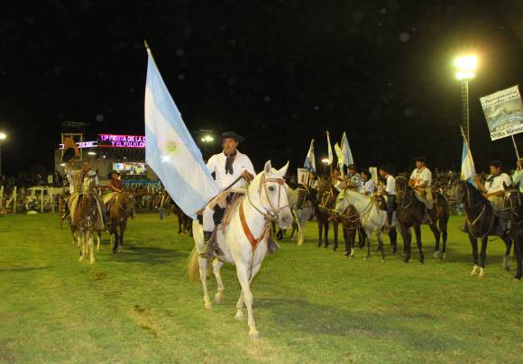 Pasadas las 23, los jinetes ingresaron al predio. Los caballos estaban ansiosos por terminar el recorrido y los jinetes hicieron su mejor esfuerzo por controlar a los animales. El desfile fue tan prolijo que en pocos minutos se ubicaron en filas en el centro del predio. Las agrupaciones, con sus estandartes y banderas, mostraron sus mejores exponentes en una de las fiestas gauchas más importantes de la provincia. La fila de jinetes fue encabezada por 4 hombres que, de a pie, llevaron sobre los hombros la imagen de Nuestra Señora de la Fuente. Es que el desfile estuvo cargado de mucha religiosidad. Así, pudieron realizar un homenaje a la patrona del Médano de Oro, que por una noche dejó el santuario que está frente a la plaza Bolaños, para recorrer el enorme cuadrado cubierto de césped, donde realizaron las destrezas criollas. Así se mezclaron los niños vestidos con sus mejores atuendos tradicionalistas, con los jinetes que estaban elongando al costado del predio, cerca del alambrado, tras haber participado de los distintos juegos de destrezas criollas. El desfile fue presenciado por familias enteras que llegaron al predio José Dolores bien temprano para conseguir un buen lugar. Alrededor del predio abundaron las conservadoras, las reposeras y el mate, en medio de una noche que en varias oportunidades amenazó con arruinarse tras las oleadas de viento terroso y algunas gotas de lluvia que no fueron más que una amenaza. Entre los integrantes del desfile estuvieron el vicegobernador Sergio Uñac y el intendente Juan Carlos Gioja, que se mezclaron entre el gauchaje e ingresaron al predio a caballo. El desfile llegó a su punto más emotivos cuando los 400 jinetes cantaron el Himno.