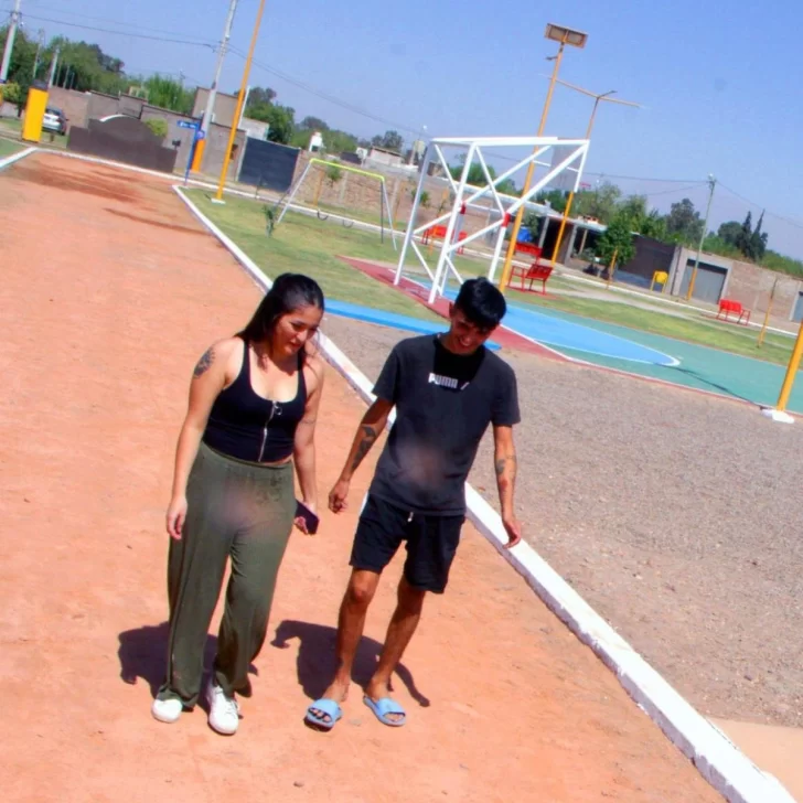 La plaza que acaban de inaugurar en el Barrio Colonia Zapata, en Santa Lucía, parece un polideportivo a cielo abierto. Tiene un playón enorme para varias disciplinas deportivas (incluye hasta arcos de fútbol y aros de básquet), un “circuito de la salud” con aparatos para hacer ejercicios físicos y, lo más llamativo de todo, una pista de atletismo en todo el perímetro. Se trata de la plaza Viñas del Este, construida por el municipio durante la gestión de Juan José Orrego y bautizada de ese modo por los propios vecinos del barrio. La fuerte impronta deportiva tiene que ver además con la cercanía de los clubes Deportivo de Villa San Pablo, Deportivo Barrio San Lorenzo y Deportivo Sol de Mayo, que se conectan en el espacio urbano y con la gente de esa comunidad.