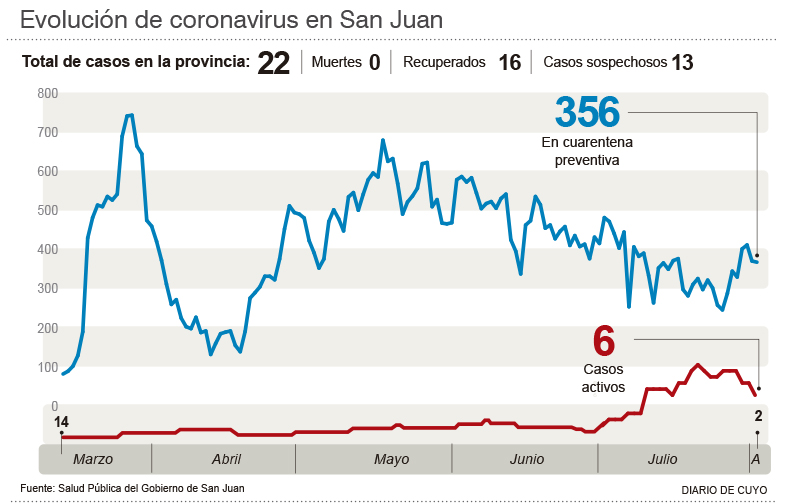 Un domingo movido tuvo San Juan con la confirmación de dos nuevos contagiados, cuatro recuperados y otro falso positivo en un test rápido. Los casos 21 y 22 son asintomáticos: uno es contacto estrecho del caso 19 y el restante es una repatriada, precisaron. De esta manera, la provincia registra seis casos activos.