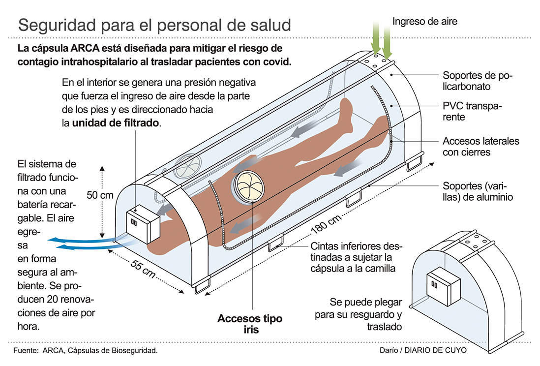 Un aspecto clave para realizar aeroevacuaciones covid es la cápsula de bioseguridad que inventó un grupo de profesionales sanjuaninos, un desarrollo que traspasó fronteras y hasta fue reconocido por el Ministerio de Ciencia de la Nación. Esta cápsula de bioseguridad se utiliza para transporte interno de pacientes con covid-19 (o sospecha) y tiene acceso lateral y presión negativa, lo cual impide que cualquier microorganismo que se encuentre dentro del habitáculo salga al exterior (ver infografía). La desarrollaron técnicos y bioingenieros del Servicio de Ingeniería Clínica del hospital Rawson y además de usarla en vuelos sanitarios también fabricaron otras para ser utilizadas en diferentes centros de salud.