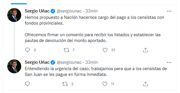 Uñac abrió un hilo en twitter, completando con la frase: "Ofrecemos firmar un convenio para recibir los listados y establecer las pautas de devolución del monto aportado".