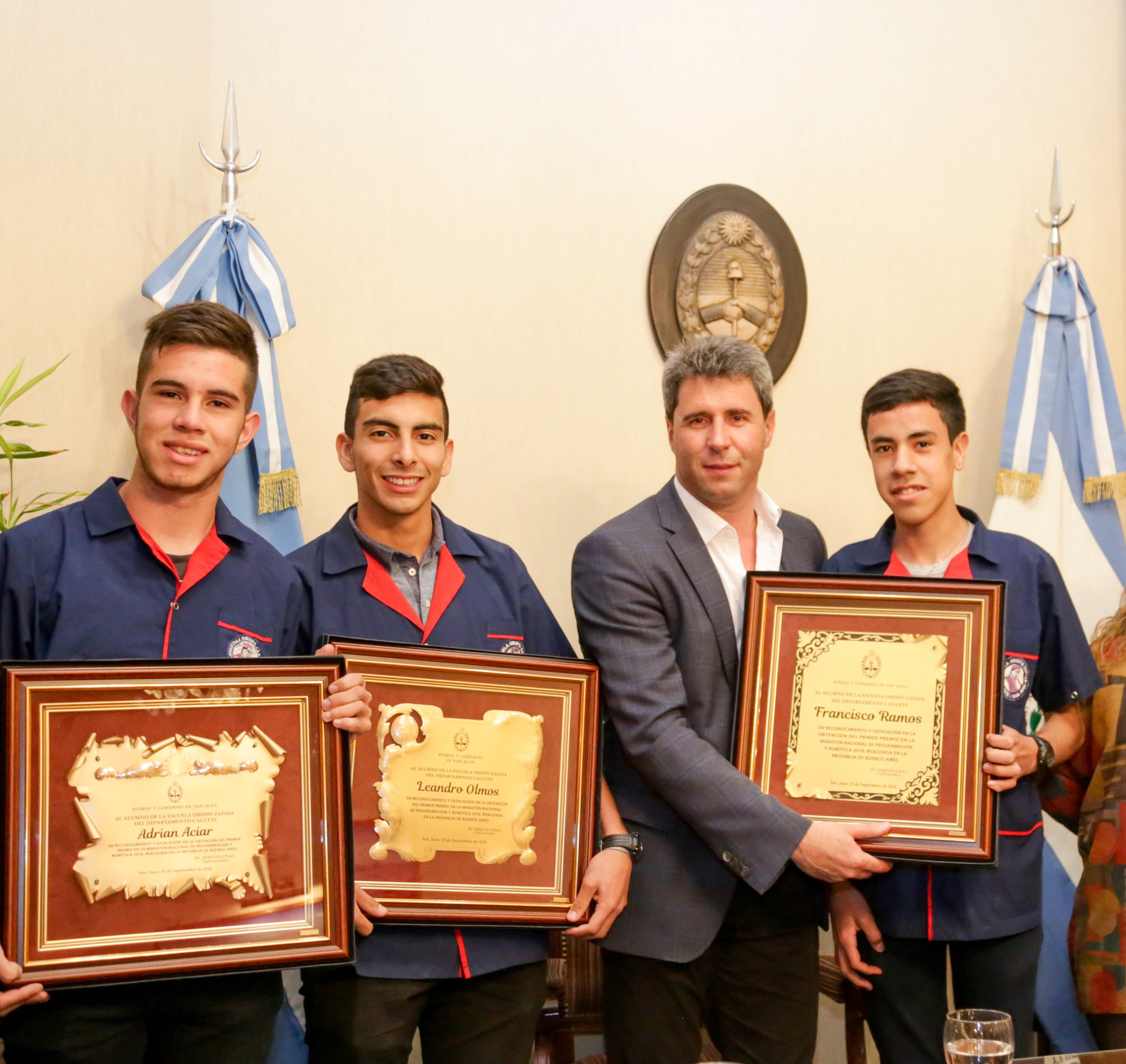 El gobernador Uñac felicitó a los jóvenes estudiantes por el premio diciendo que "todo tiene su esfuerzo, su merecido, su recompensa" y los instó a seguir en el camino del perfeccionamiento.