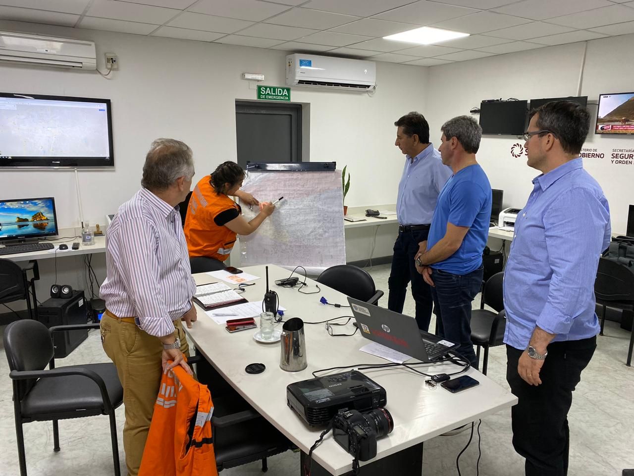 El gobernador Sergio Uñac junto al Ministro de Desarrollo Humano, Fabián Aballay; el secretario de Seguridad Carlos Munisaga y el director de Protección Civil, Francisco Suraci, siguieron el informe de situación durante y posterior a las fuertes ráfagas que se presentaron desde las 22:00 horas en la provincia y se extendieron hasta pasada la medianoche del 25 de diciembre.
