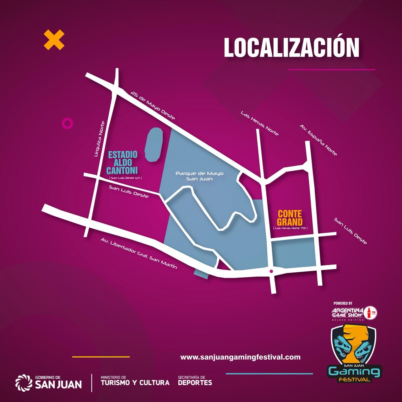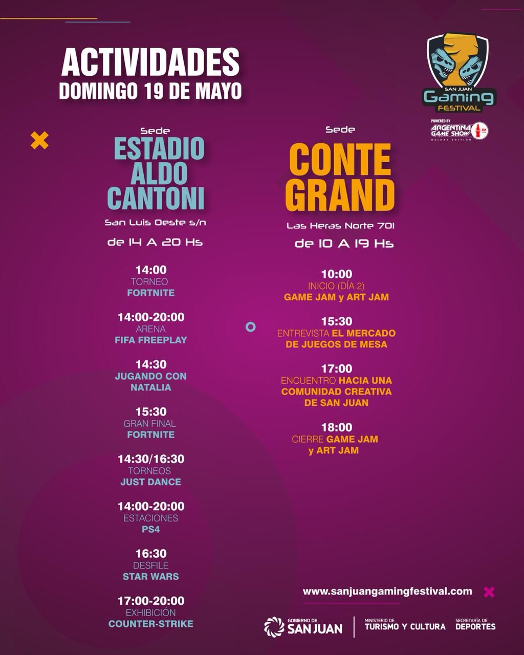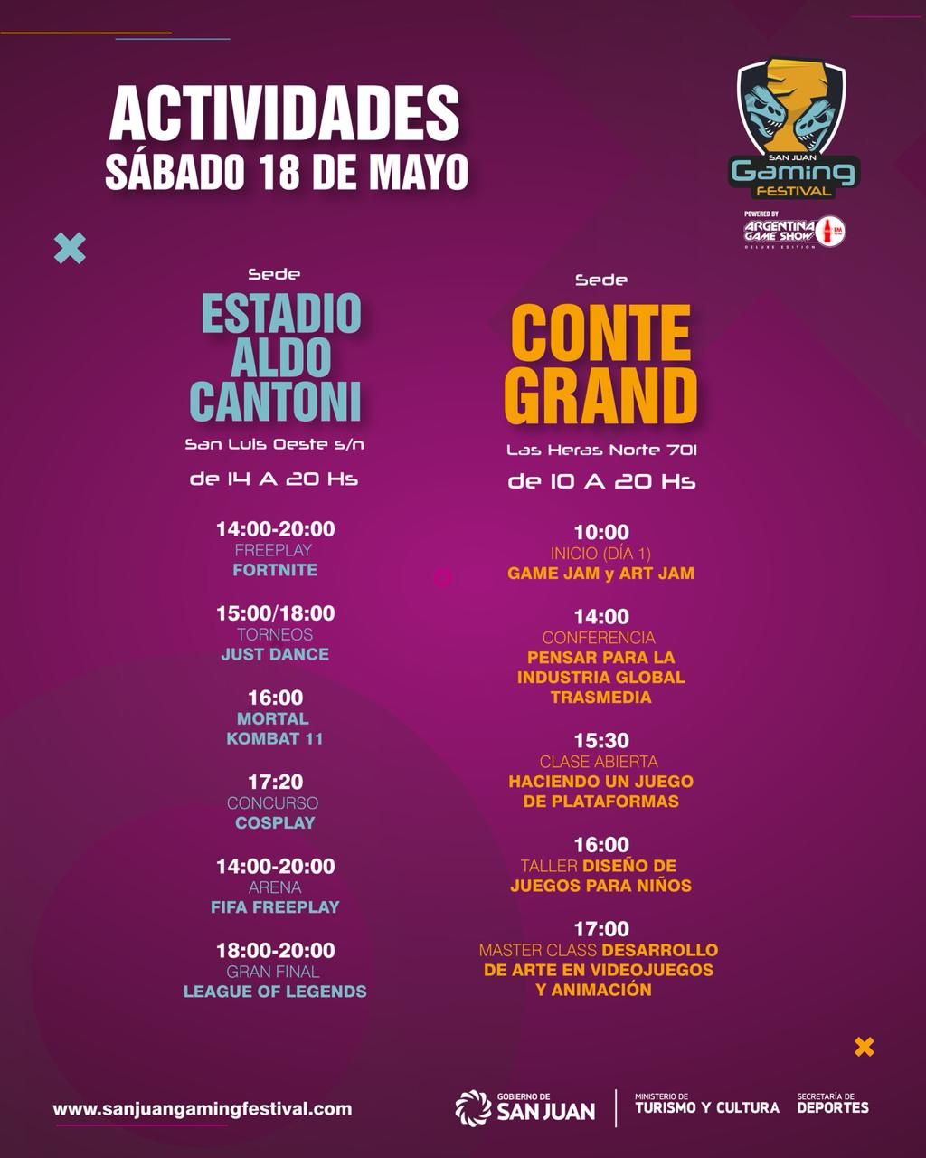 * Lugar y horario: en el Estadio Aldo Cantoni las actividades se realizarán de 14 a 20, los dos días. En tanto, en el Centro Cultural Conte Grand la Art Jam y el Game Jam se desarrollarán de 10 a 20.