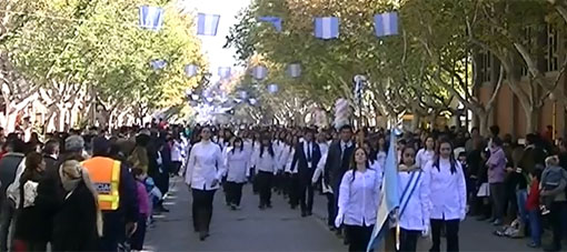 San Juan, 25 de mayo.- Un clima de fiesta se vivió este medio día sobre calle Avenida Ignacio de la Rosa por los festejos del 25 de Mayo. Cerca de unos 2.000 chicos de unos 42 establecimientos educativos se lucieron con sus uniformes y sus pasos al compás de la música de la banda de la Policía provincia y del RIM 22.