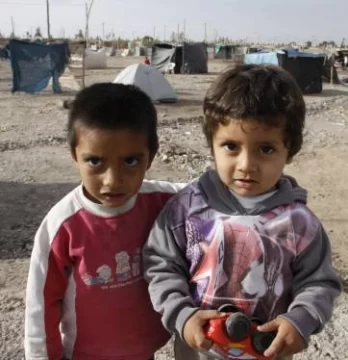 Tiziano y Uriel, de 1 y 3 años respectivamente, dormían ayer adentro de un rancho construido de nailon y palos, que se mantenía en pie de milagro, mientras su papá Sergio trabajaba para asegurarlo con alambre, luego del viento Zonda que sopló el domingo a la madrugada y que hizo estragos en el lugar. Esta postal se repetía en cada una de las casillas que fueron levantadas en el baldío que usurparon más de 100 familias, en calle 25 de Mayo frente al barrio Cipolletti, en Chimbas. Según los propios vecinos del asentamiento, hay cientos de niños viviendo en el lugar.