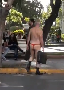 Nadie lo podía creer. Plena tarde sanjuanina y en el corazón de la ciudad, un hombre mayor, canoso, con maletín, zapatos y medias negras se paseaba por el centro sanjuanino con una tanga roja. Sí, así como leen.