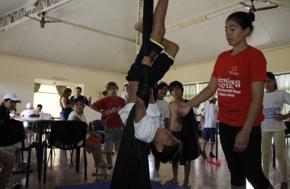 No es un circo, simplemente es una colonia de verano. Sin embargo, las acrobacias en telas se pueden practicar todas las mañanas. Así, lejos del vértigo, los chicos disfrutan cada minuto que tienen para poder despegarse del piso. Descalzos, concentrados en las indicaciones de la profesora y con la adrenalina a full por subir, los niños de Chimbas hacen colas para practicar las danzas aéreas.