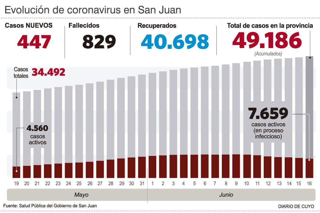 Por otro lado, hubo un ascenso en la cantidad de casos positivos, ya que ayer reportaron 447. Con esta cantidad, el acumulado ahora es de 49.186 personas infectadas. De ellas, hay 7.659 casos activos, de los cuales 266 requieren internación. A su vez, 130 pacientes permanecen internados en área crítica pacientes, de los cuales 65 tienen asistencia respiratoria mecánica. La ocupación de camas UTI es de 84,5%.