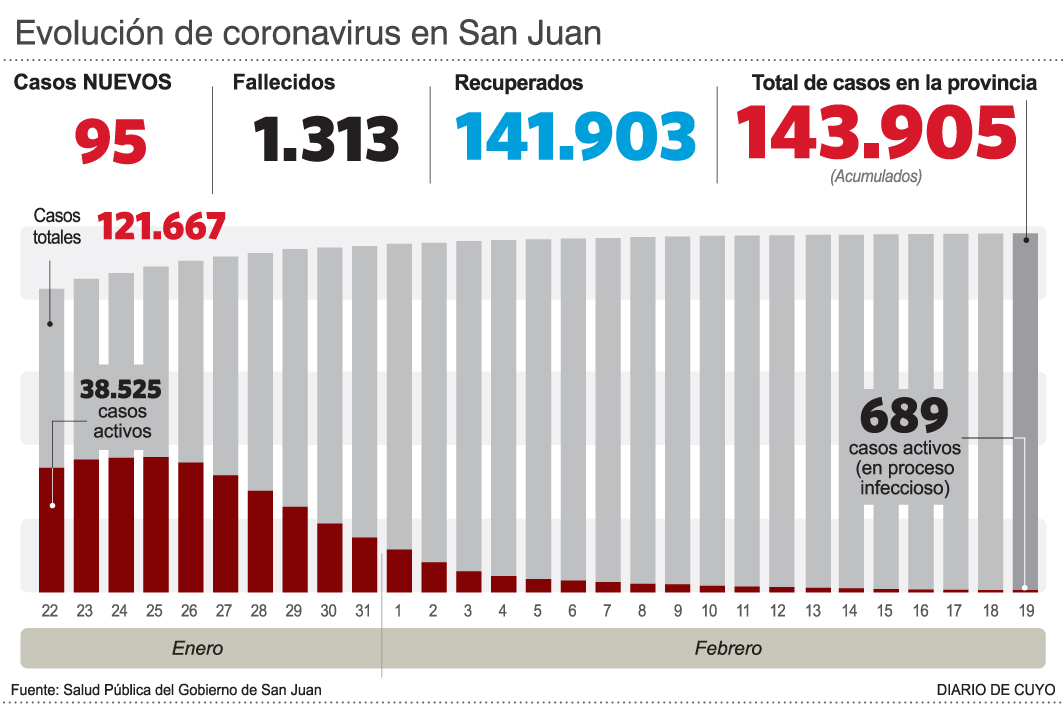 Por otro lado, nuevamente San Juan reportó menos de un centenar de nuevos casos diarios. Los 95 positivos confirmados ayer surgieron tras procesar casi 700 test y ahora el acumulado en pandemia tiene 143.905 infectados.