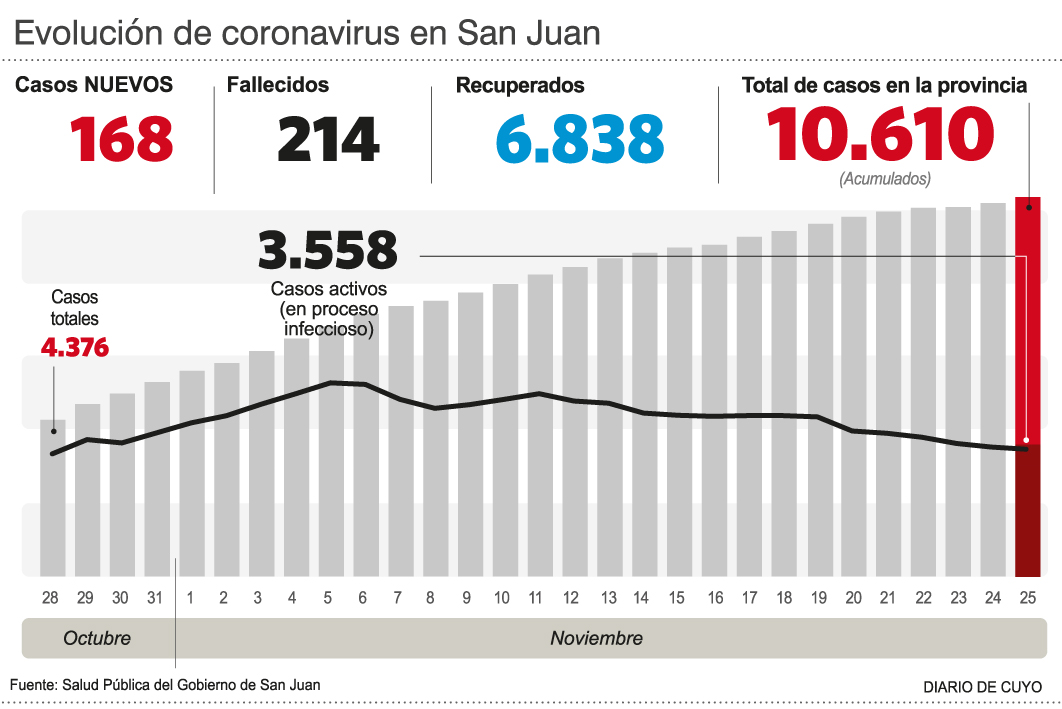 Por otro lado, ayer fueron reportados cuatro decesos (tres mujeres de 56; 77 y 73 años y un hombre de 59), por lo ya suman 214 los fallecidos por Covid. A su vez, con 168 nuevos casos, el total de confirmados es de 10.610; en tanto que hay 102 pacientes internados en áreas críticas (47 con respirador).