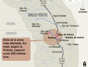 San Juan, 6 de noviembre.- Una intensa lluvia cayó esta madrugada en Valle Fértil, más precisamente en la zona de Sierra de Riveros, provocando una importante crecida que bajó hasta la localidad de Astica y afectó a unas 10 familias que tuvieron que ser evacuadas.