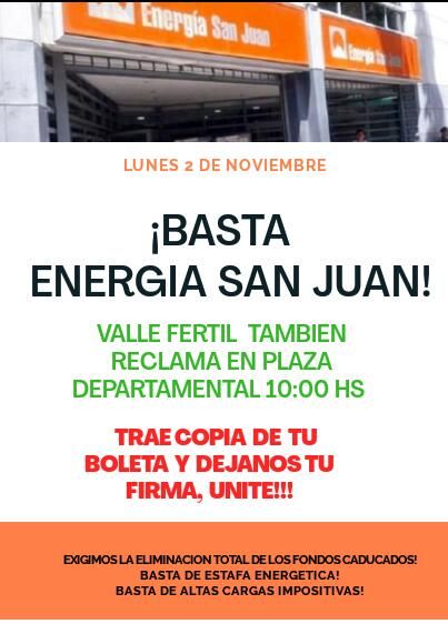 El próximo lunes 2 de noviembre, ciudadanos de Valle Fértil se concentrarán en la plaza departamental para manifestarse en contra de los aumentos recibidos en las boletas de la luz que envía Energía San Juan.