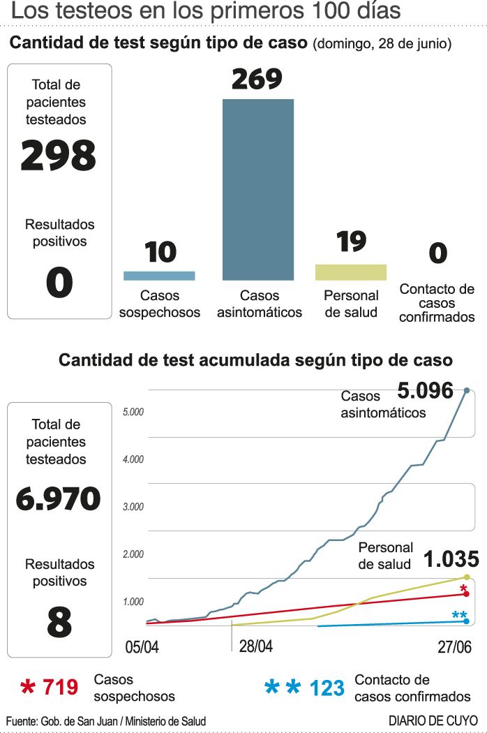 Desde la división Bioquímica realizaron un informe detallado sobre la cantidad de testeos que ya realizó el Ministerio de Salud Pública desde que comenzó la cuarentena. En total, hasta ayer el domingo, día en el que se marcó un récord totalizando 298 test en un solo día, se llevaban realizados 6.900 testeos. De esa cantidad, 5.096 pertenecen a personas asintomáticas, en este grupo se encuentran los transportistas, las personas repatriadas en hoteles y personal y residentes de geriátricos. Siguiendo con el detalle de ese grupo, en total 2.513 se hicieron a repatriados en los hoteles, 1.223 se han realizado a los transportistas ya sea en domicilios particulares, en las empresas de transporte y en los tres ingresos habilitados y 264 fueron los realizados en la cabina de hisopados que estaba ubicada en Emicar y que ahora se trasladó al Estadio del Bicentenario.