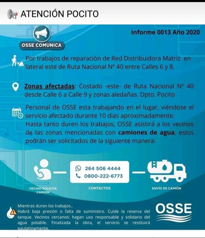 El agua es no sólo es un servicio sino que es un derecho humano. Desde hace 3 días, vecinos de Pocito lo ven coartado y la solución, de acuerdo a lo que expresan, es insuficiente. Además del tiempo que llevan, desde OSSE confirmaron que la situación se extenderá por 10 días más. Obras en Ruta 40, que abarcan el tramo desde calle 6 a 9, son la razón de la extensa interrupción.