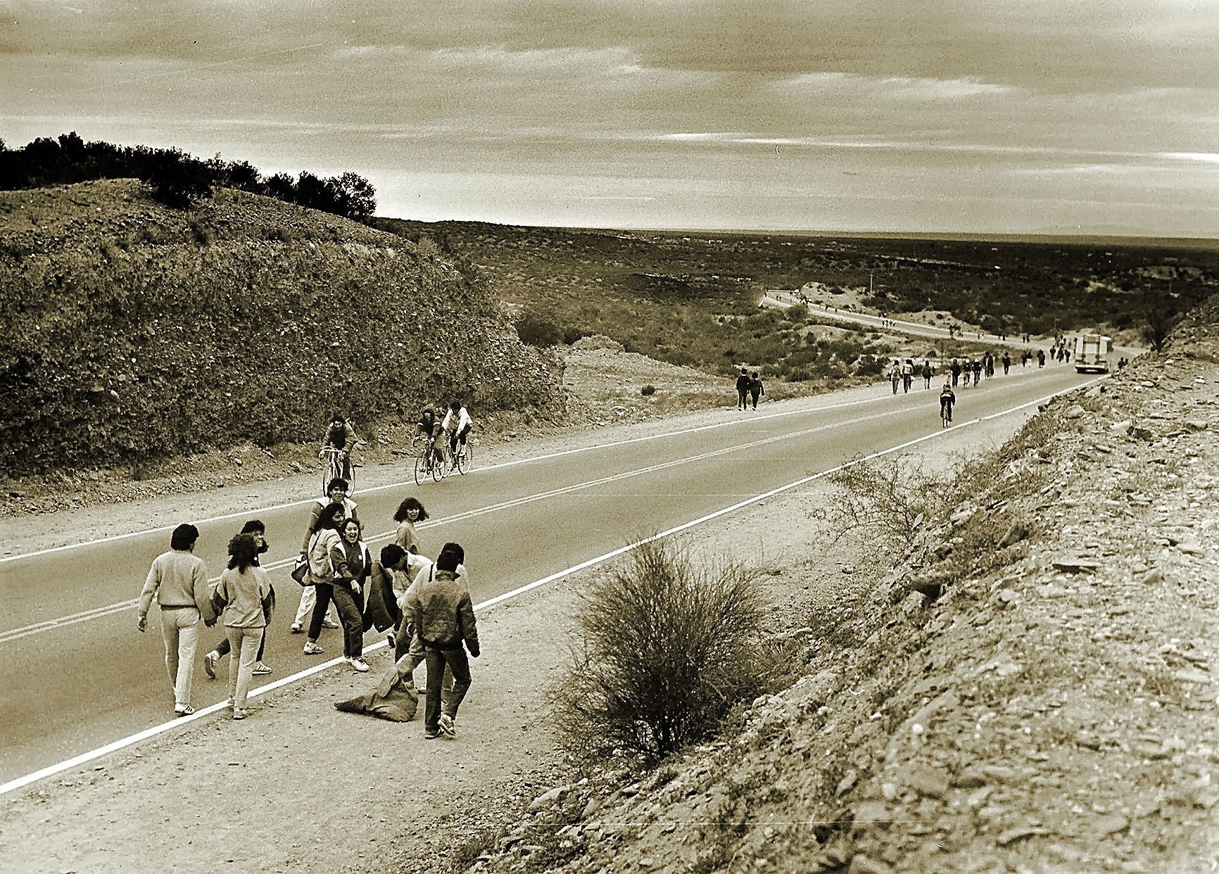 De camino al paraje. Los peregrinos caminando rumbo a la Difunta Correa es algo que sucede desde la década del ’60. Esta imagen fue tomada en 1987.