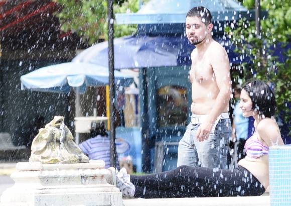 La elevada temperatura que se registró ayer en la provincia hizo que varios peatones que circulaban en plena siesta por el centro, aprovecharan la fuente de agua de la Plaza 25 de Mayo para darse un chapuzón. Fue el caso de una pareja de turistas rosarinos que llegaron a San Juan por el fin de semana largo y no dudaron en tomar un baño para soportar el calor.