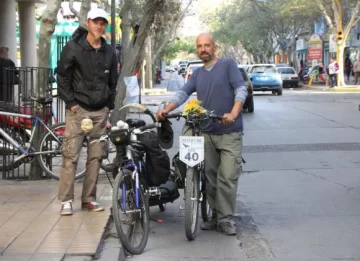 Miguel Gorrina y Nahuel Gómez Huertos, emprendieron hace 3 meses una aventura para unir la Quiaca con Ushuaia y hace unos días llegaron a San Juan. Los bonaerenses se quedarán unos días en la provincia y volverán al viaje que hacen por la Ruta 40. ’Los sanjuaninos son muy cálidos. La primera noche la pasamos en una comisaría de Rawson’, dijo Nahuel.