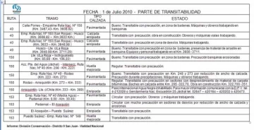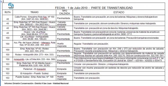San Juan, 1 de julio.- En el día de hoy Vialidad Nacional emitió el primer parte. Lo hará dos veces por semana. Si viaja, revise el estado de las rutas locales.