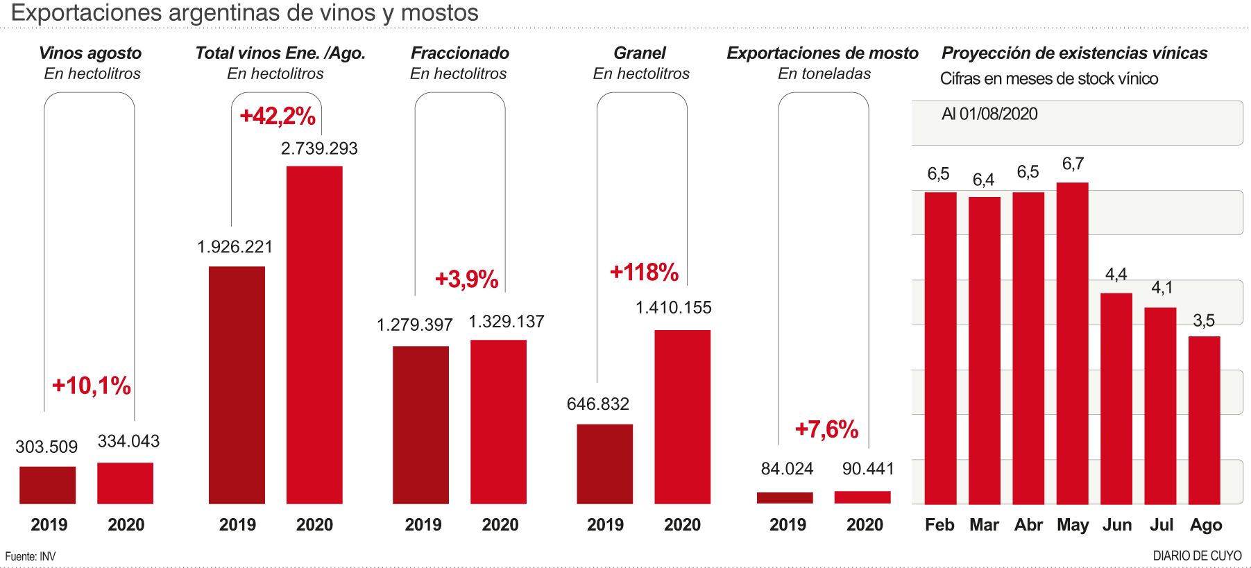 La menor cosecha de uvas pasada, el crecimiento del consumo en el mercado interno y de exportaciones determino que en el primer semestre 2020 los stocks vínicos cayeron a la mitad, a 3,5 meses de stock, según cifras del INV