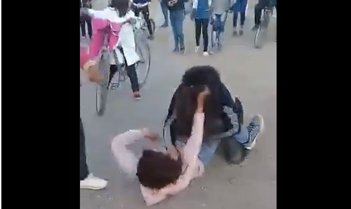 En las imágenes se ve cómo las chicas se toman del pelo, se pegan y se agreden mientras ruedan por la calle. Otros niños y jóvenes las rodean y observan sin hacer nada. Hasta que, un hombre que circunstancialmente pasa en moto, se detiene y les pide que las separen. Es ahí cuando todos se acercan.