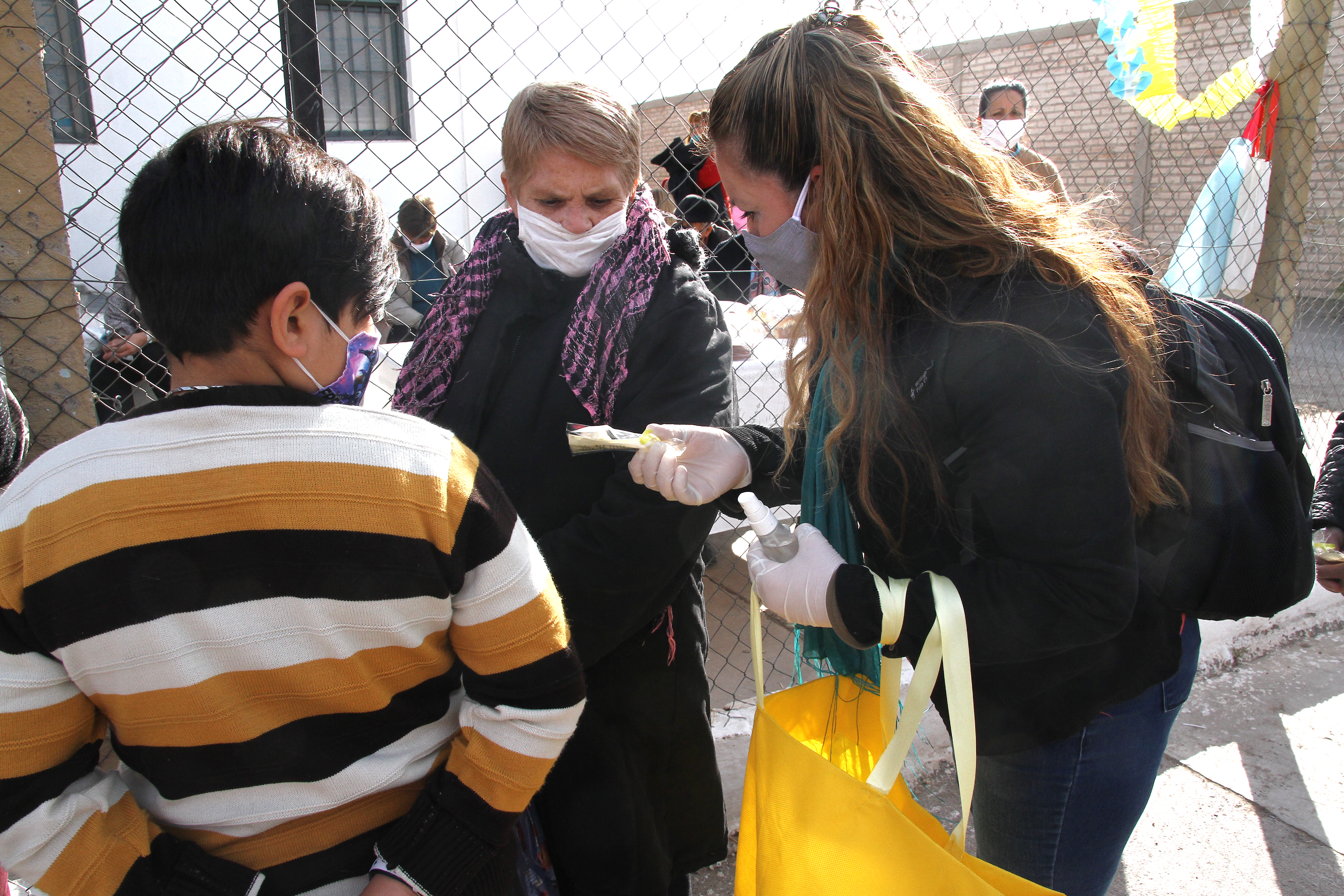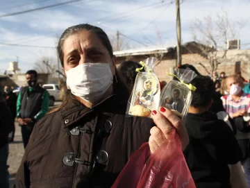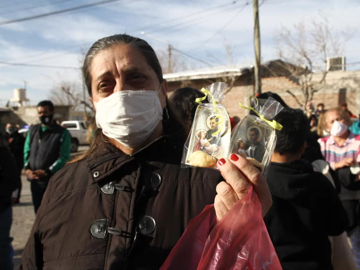 Al igual que Vanesa, Deyanira Alaniz también entregaba un presente a todo el que pasaba por al lado de ella. Con guantes, sacaba de una bolsa de tela estampitas con un minúsculo pan, envueltos en una bolsita. Antes de entregarlos, Deyanira rociaba con un spray. "Estaré siempre agradecida a San Cayetano, porque siempre intercedió por mi familia. Por eso, vamos duplicando cada año la cantidad de estampitas que repartimos, salvo este año que trajimos solamente 200 porque sabíamos que no habría más gente. El año que viene, si hay procesión, vamos a entregar 1.600”, adelantó.