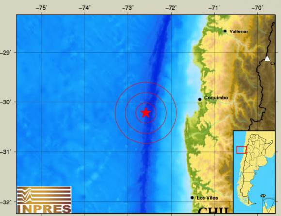 Según el registro del Instituto Nacional de Prevención Sísmica, el movimiento ocurrió a tan sólo 10 kilómetros de profundidad en un punto distante a 127 kilómetros al Oeste de la ciudad chilena, en las costas de Coquimbo, y a 419 kilómetros al Oeste de la Ciudad de San Juan.
