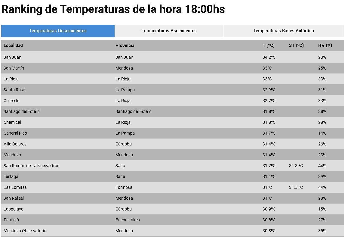 Según el Servicio Meteorológico Nacional, el termómetro trepó hasta los 34,2 grados con un 20 por ciento de humedad a las 18, superando así a Mendoza y La Rioja, ambas con 33º.