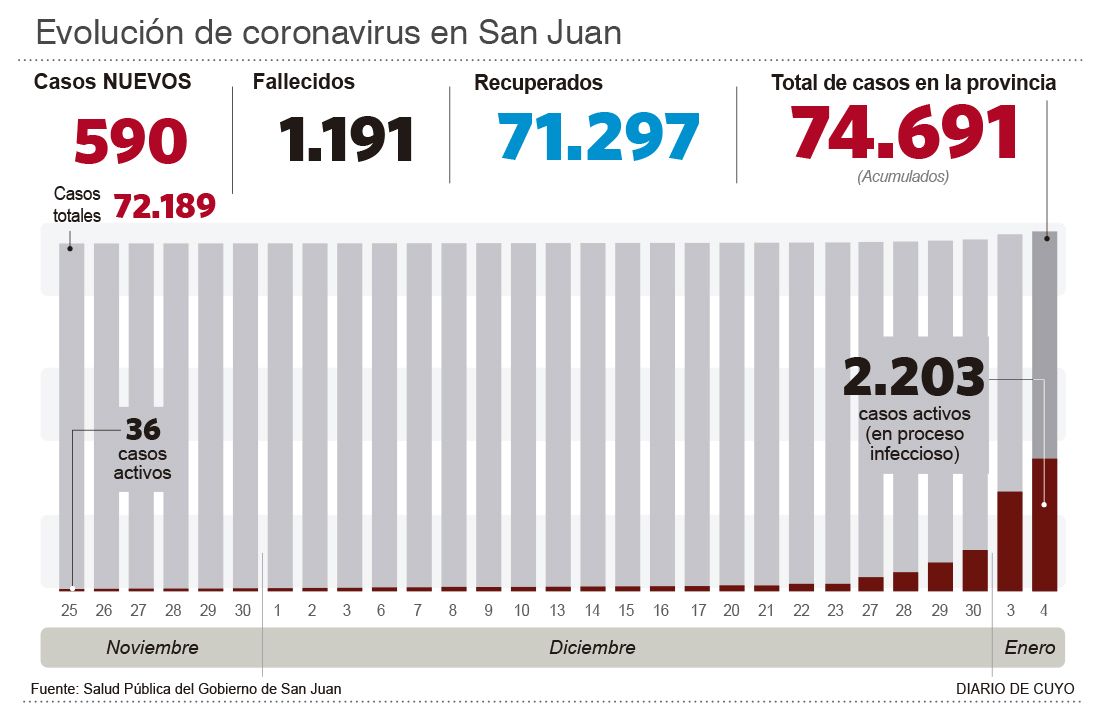 Ayer Salud Pública informó que en la última jornada fueron registrados en la provincia 590 nuevos contagios de coronavirus, lo cual marca un récord absoluto en lo que va de la denominada "tercera ola" de covid en todo el país. Al mismo tiempo, la cifra es la novena más alta desde que el virus ingresó a San Juan y comenzó a infectar gente.