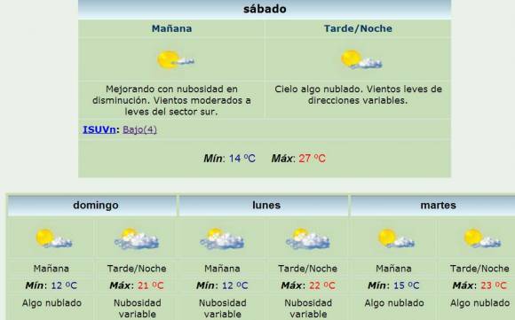 Para mañana domingo, la máxima estimada es de 21 grados con una mínima de 12. El cielo estará algo nublado durante toda la jornada.